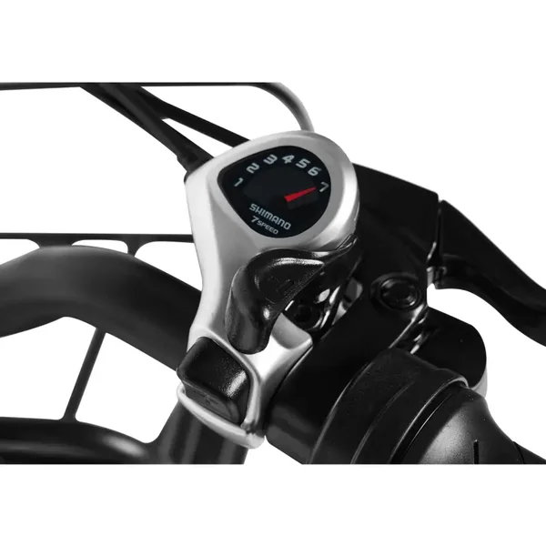 ⬤ Écran LCD intégré affichant le compteur de vitesse, l’odomètre, le niveau d’assistance au pédalage et l’indicateur de batterie.